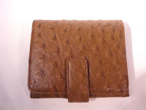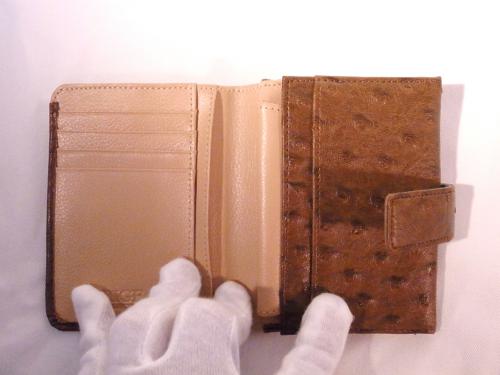 落ち着いたキャメル色の二つ折り財布です。気品溢れるオーストリッチ風!お札、小銭、カード類も十分収納可能です。