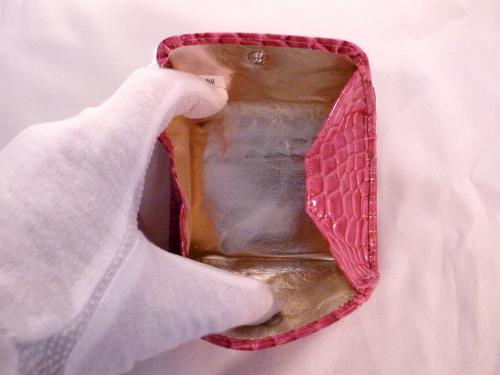 キュートなピンク色でも高級感を感じる、クロコダイル風コインケースです。まちが広いので、小銭がとても探しやすく便利です。