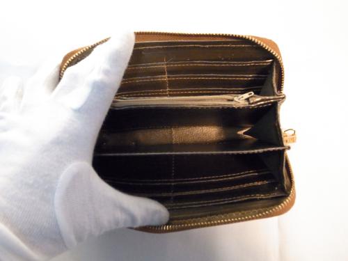 とてもおしゃれでキュートな、キャメル×ベージュのパッチワーク柄ストラップ付きラウンドファスナー長財布です。お札もカードもたっぷり収納できます。