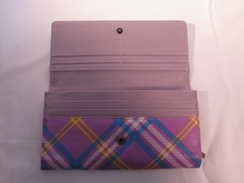 持っているだけでハッピーな気分になれそうな、ピンク色にカラフルなラインの、キュートなチェック柄長財布です。小銭入れ部分はマチが広く、とても便利です。