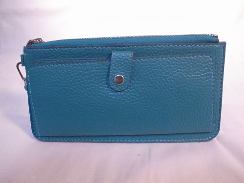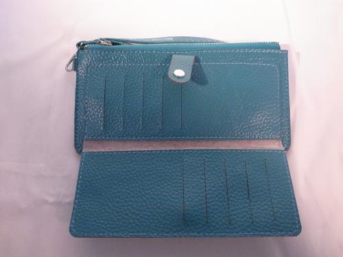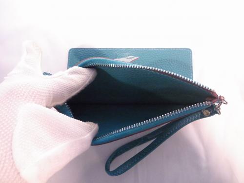鮮やかなターコイズブルーのストラップ付き長財布です。カードもたっぷりはいります。