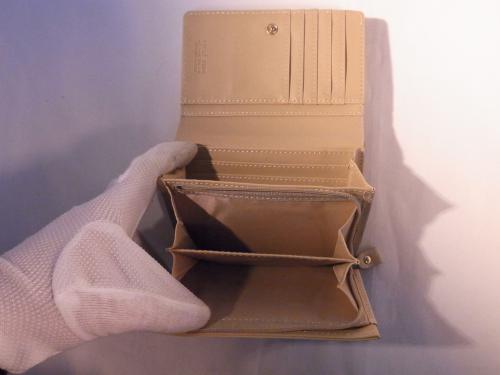 シックで落ち着いたベージュの二つ折り財布です。収納力も抜群!小ぶりなのでポケット収納も可能です。