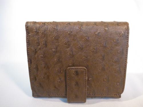 落ち着いたキャメル色の二つ折り財布です。気品溢れるオーストリッチ風!お札、小銭、カード類も十分収納可能です。