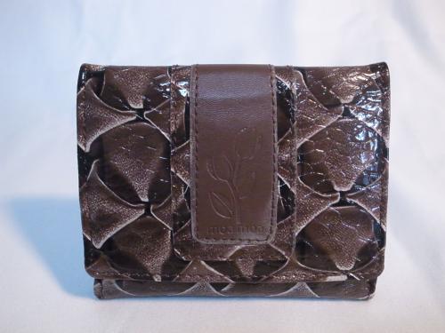 シックな艶のあるブラウンに、シャレなクロコダイル風の型押しがされた二つ折り財布です。オシャレなだけでなく、収納力も抜群です!