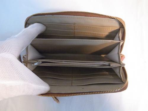 とてもおしゃれでキュートな、キャメル×ベージュのパッチワーク柄ストラップ付きラウンドファスナー長財布です。お札もカードもたっぷり収納できます。