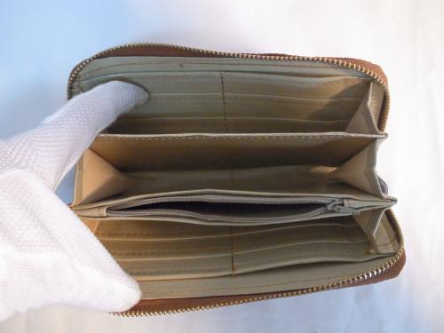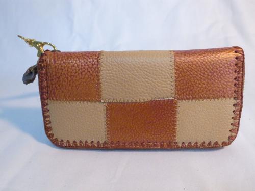 とてもおしゃれでキュートな、キャメル×ベージュのパッチワーク柄ストラップ付きラウンドファスナー長財布です。お札もカードもたっぷり収納できます。