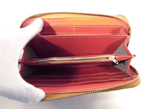 とてもおしゃれでキュートな、キャメル×ベージュ×ブラウンのパッチワーク柄ストラップ付きラウンドファスナー長財布です。お札もカードもたっぷり収納できます。