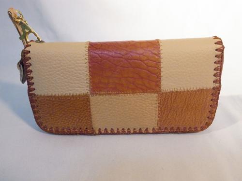 とてもおしゃれでキュートな、キャメル×ベージュのパッチワーク柄ストラップ付きラウンドファスナー長財布です。お札もカードもたっぷり収納できます。