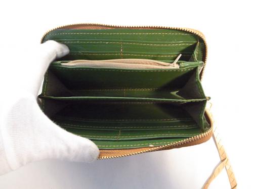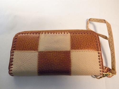 とてもおしゃれでキュートな、キャメル×ベージュのパッチワーク柄ストラップ付きラウンドファスナー長財布です。お札もカードもたっぷり収納できます。