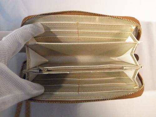 とてもおしゃれでキュートな、キャメル×ベージュのパッチワーク柄ストラップ付きラウンドファスナー長財布です。お札もカードもたっぷり収納できます。